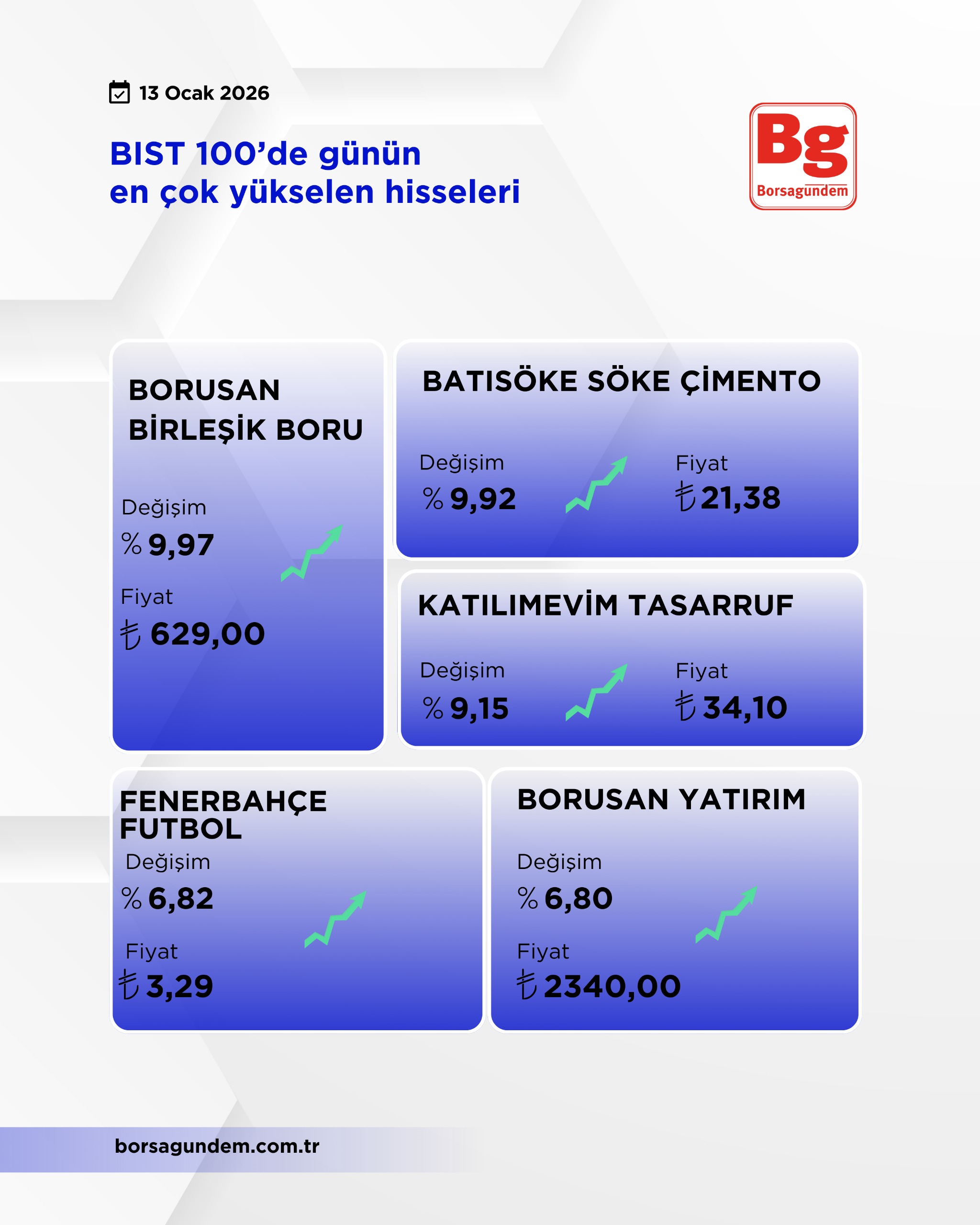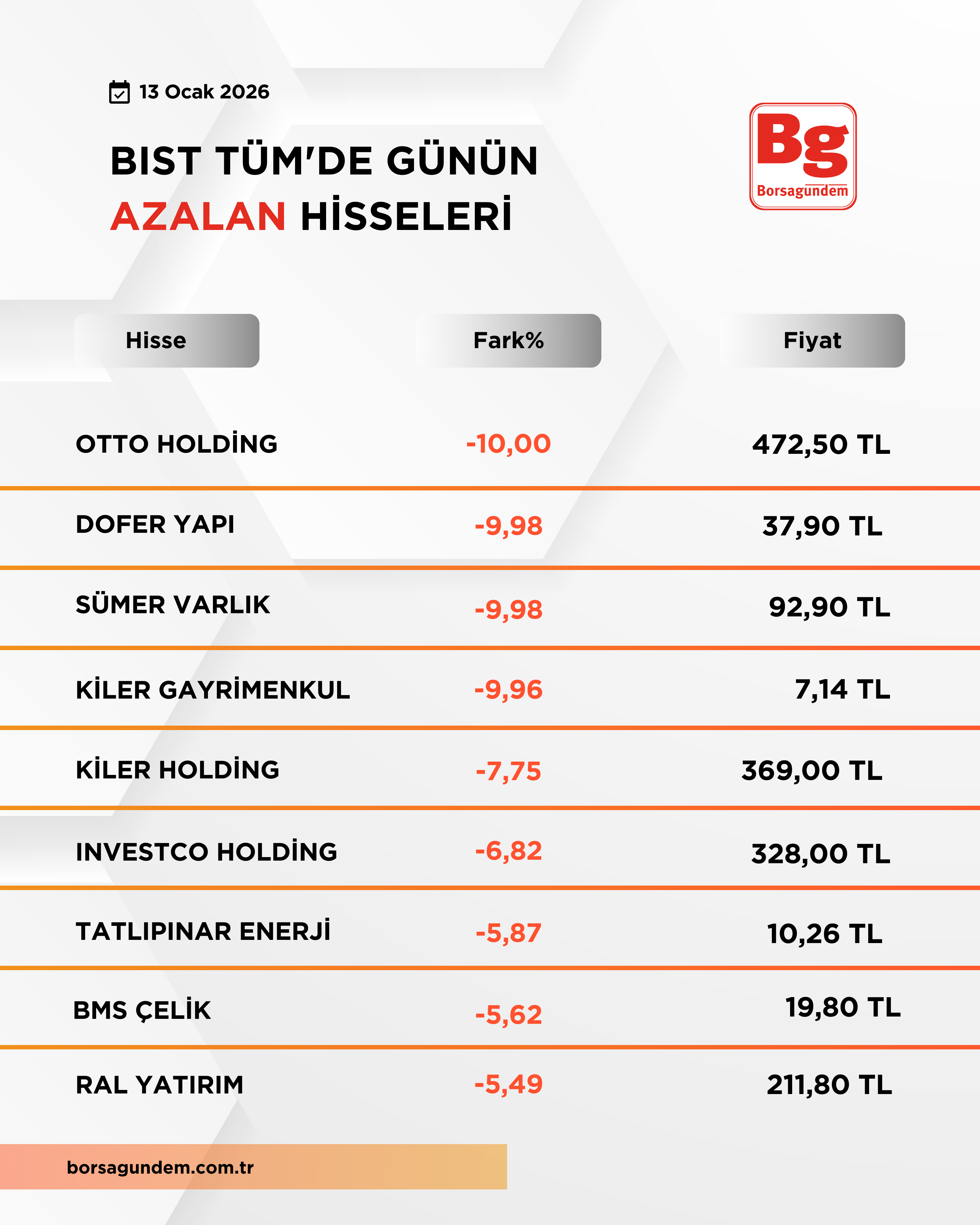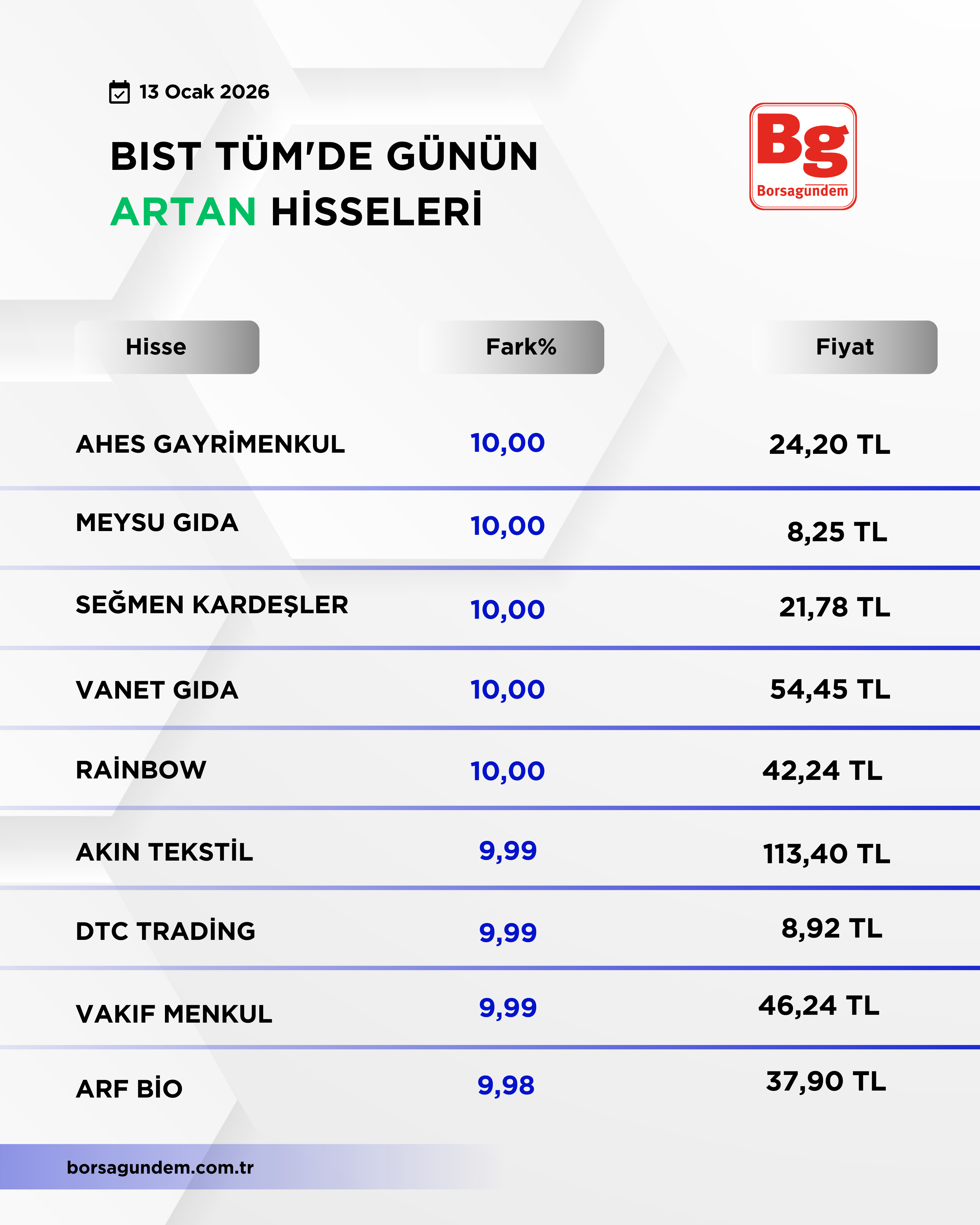 Borsa İstanbul'da 13.01.2026 tarihli günün en çok artan ve azalan hisseleri...