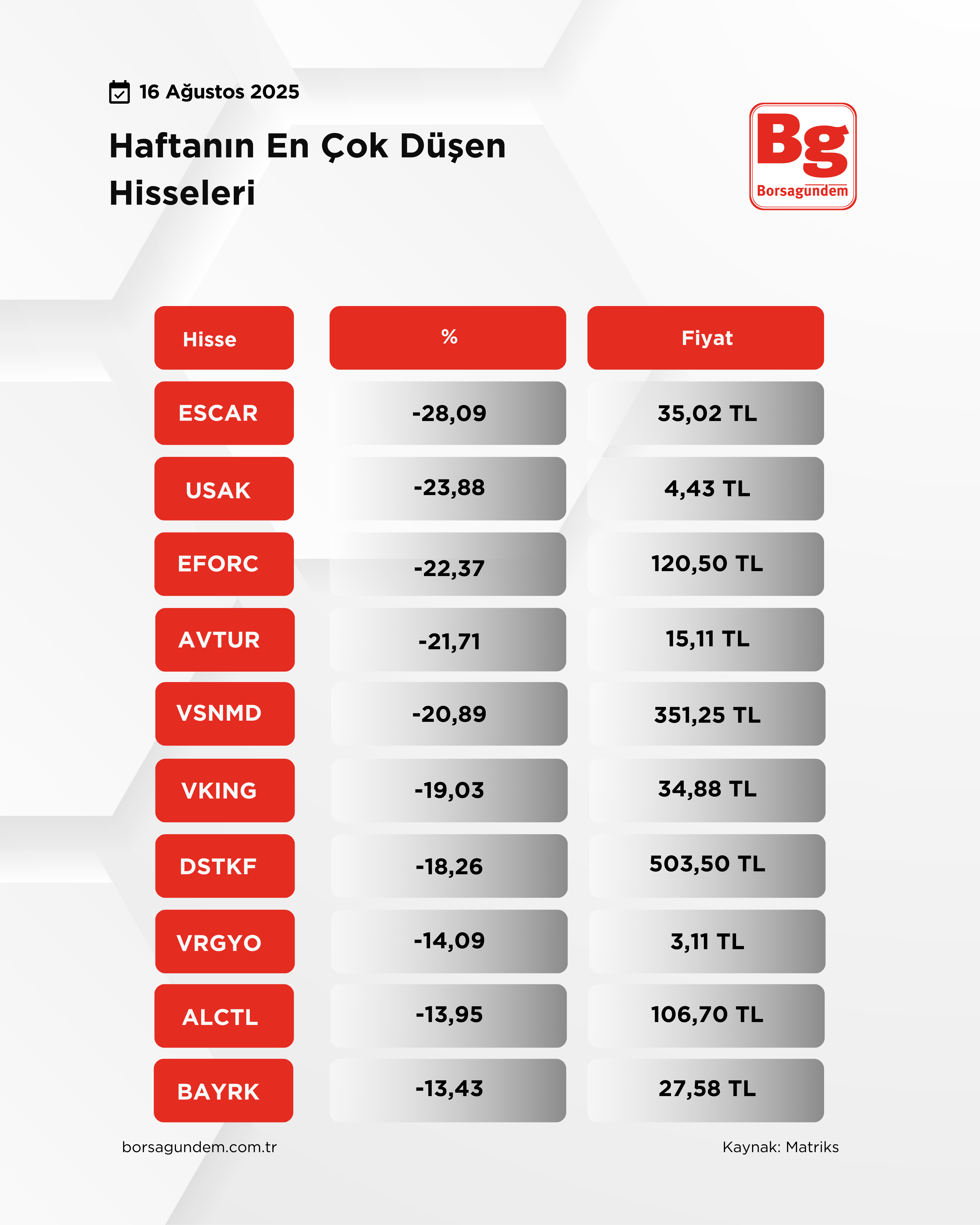 Diğer yandan; ESCAR %28,09, USAK %23,88 ve EFORC ise %22,37'lİk düşüşler yaşadı.