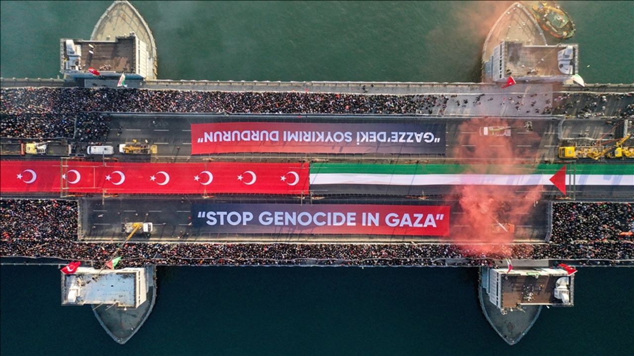 Türkiye Gençlik Vakfı (TÜGVA) öncülüğünde düzenlenen Filistin’e destek eyleminde on binlerce kişi sabah namazının ardından Galata Köprüsü’ne yürüdü. Eyleme bakanlar, milletvekilleri ve çok sayıda vatandaş katıldı.
