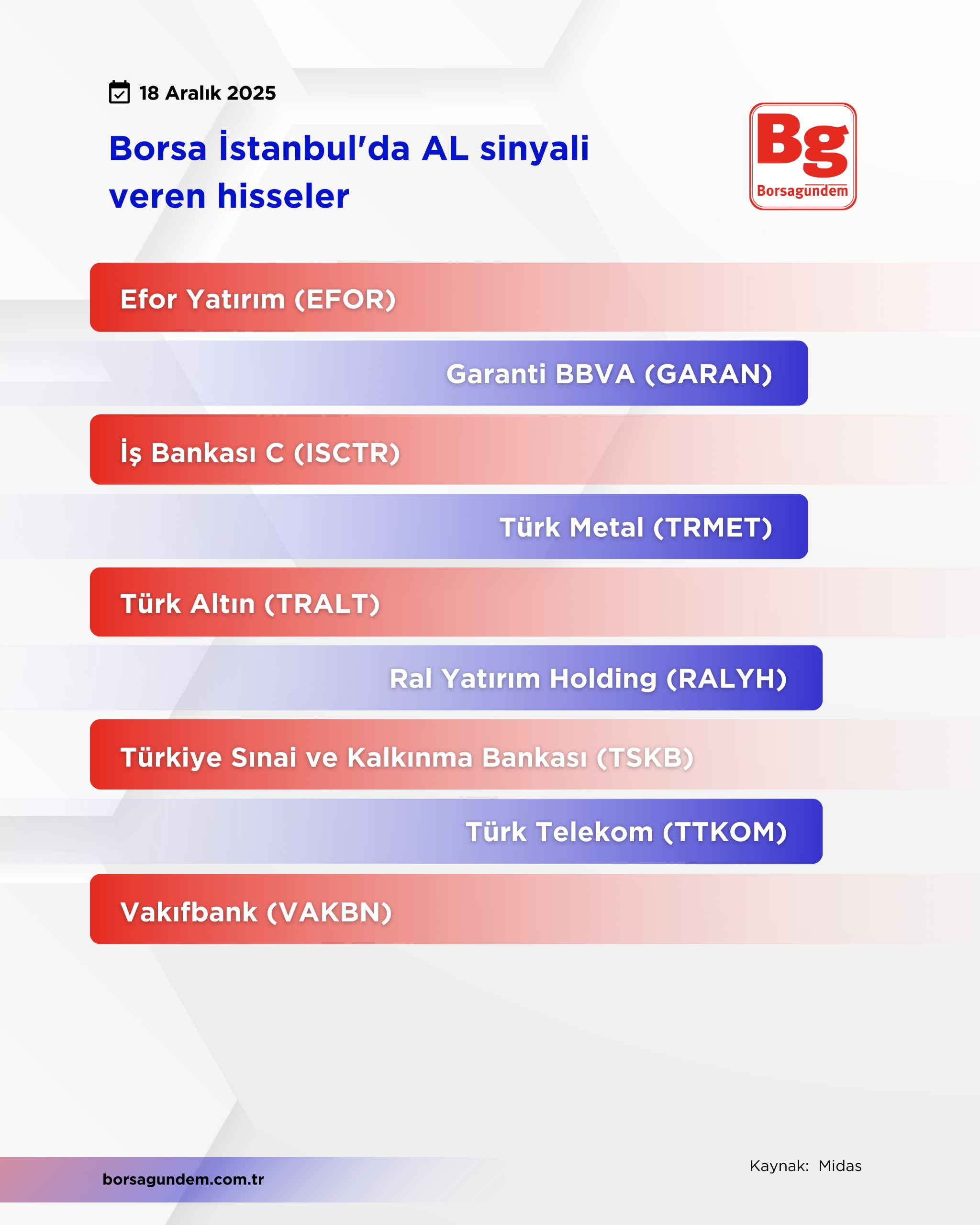 Listede, BIST 100 endeksinde bulunan, fiyatı 9, 21, 50 ve 200 günlük üssel hareketli ortalamasının üstünde olan, MACD’si 0’ın üstünde, RSI göstergesi 70’in altında Stokastik ve Stokastik RSI göstergesi 80’in altında olan hisseler yer almaktadır.
