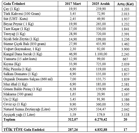 "Evde eski dergileri karıştırırken aralarında bir marketin 2017 yılı Mart ayına ilişkin fiyat broşürünü buldum (yazının altında paylaşıyorum.) Sonra aynı marketin internet sayfasına girerek aynı ürünlerin bugünkü fiyatlarını çıkardım ve bu iki fiyat setini karşılaştırdım. Bu karşılaştırma tablosu aşağıda yer alıyor (Not: 2025 Aralık sütununun son sırasında yer alan 4.832,88 lik edeks sayısı, Aralık ayı sonucu henüz yayınlanmadığı için Kasım 2025 ayına aittir.)