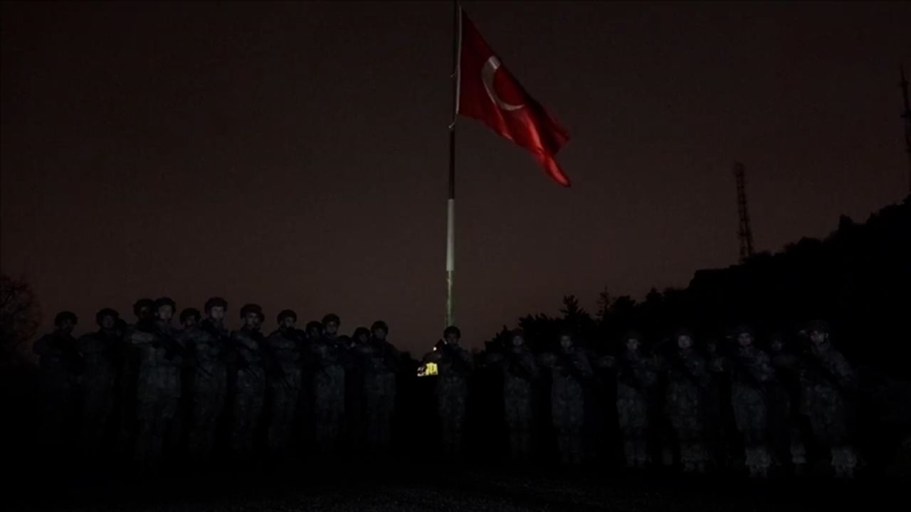 Paylaşımda ayrıca, Türk bayrağı altında görev başındaki askerlerin depremin saatinde saygı duruşunda bulunduğu görüntüler bulunuyor.
