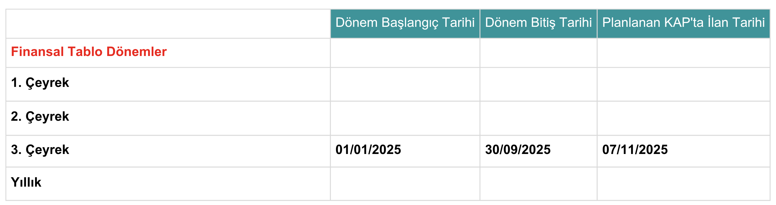 Şirketimizin 1 Ocak - 30 Eylül 2025 dönemine ilişkin finansal sonuçlarının 7 Kasım 2025 tarihinde kamuya açıklanması planlanmaktadır.