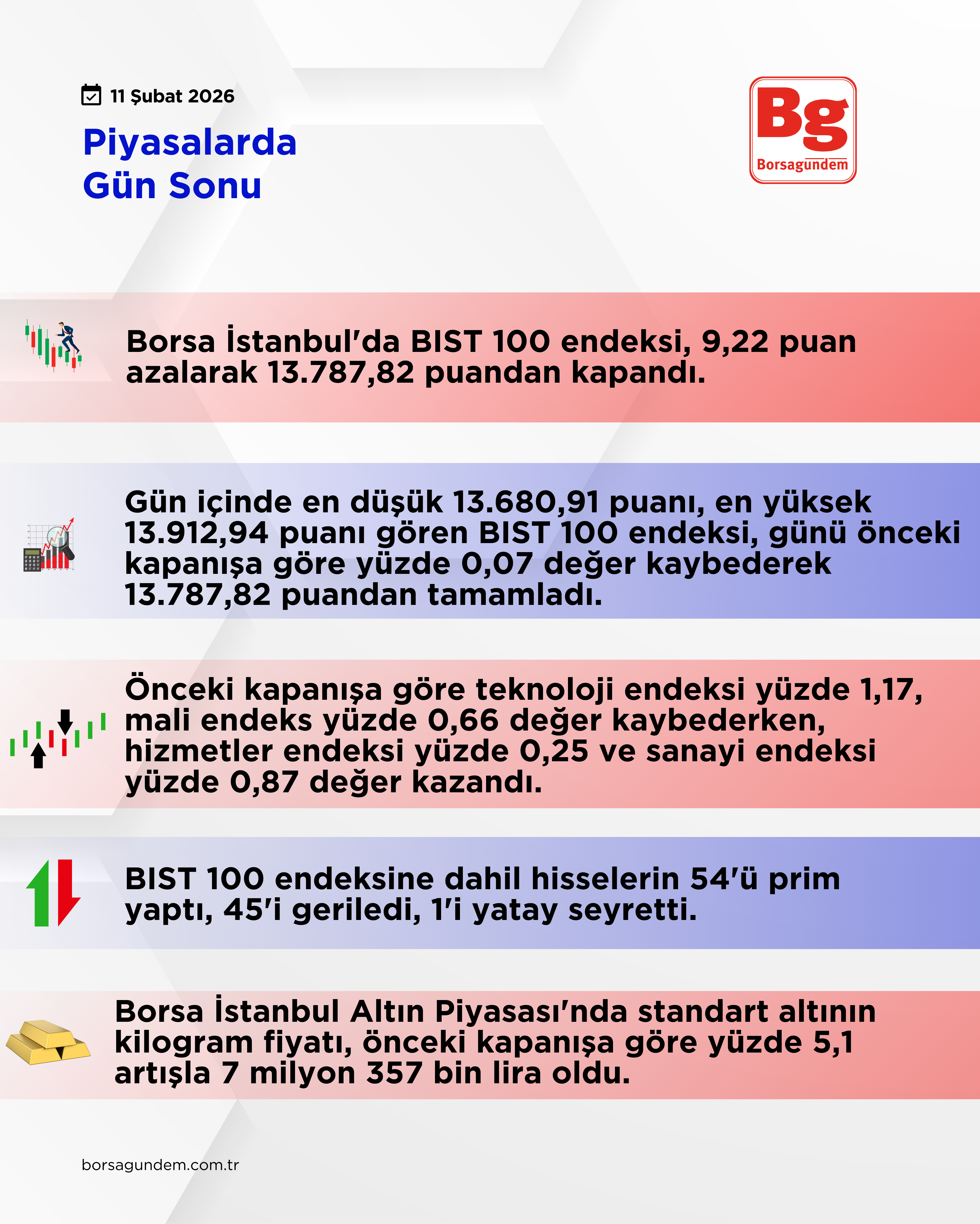 Gün içinde en düşük 13.680,91 puanı, en yüksek 13.912,94 puanı gören BIST 100 endeksi, günü önceki kapanışa göre yüzde 0,07 değer kaybederek 13.787,82 puandan tamamladı.