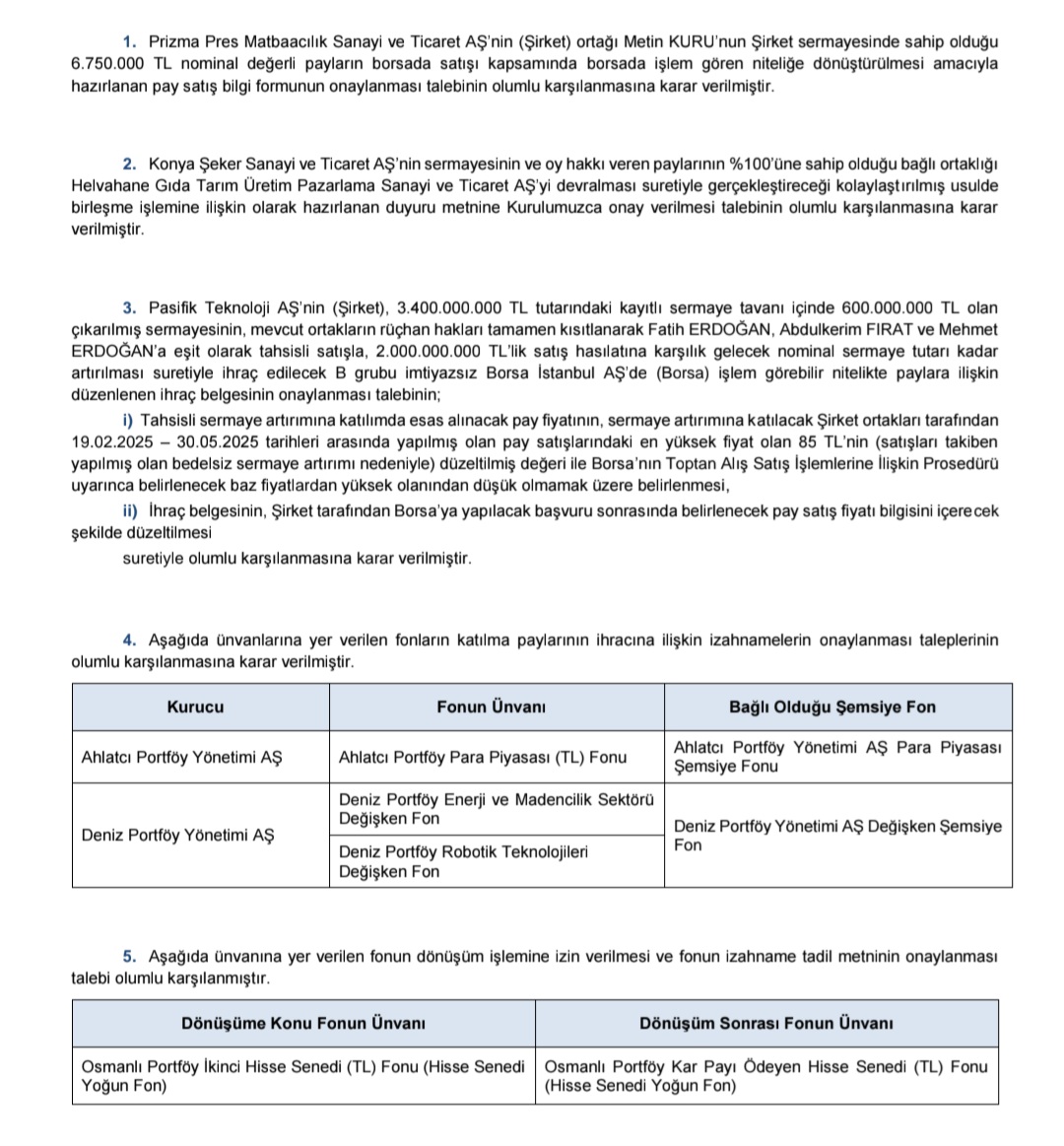 Sermaye Piyasası Kurulu (SPK), çeşitli şirketlerin pay satışı, birleşme ve fon işlemleri ile ilgili taleplerini olumlu karşıladı. Kurul tarafından yapılan açıklamaya göre, kararlar şu şekilde özetlendi: