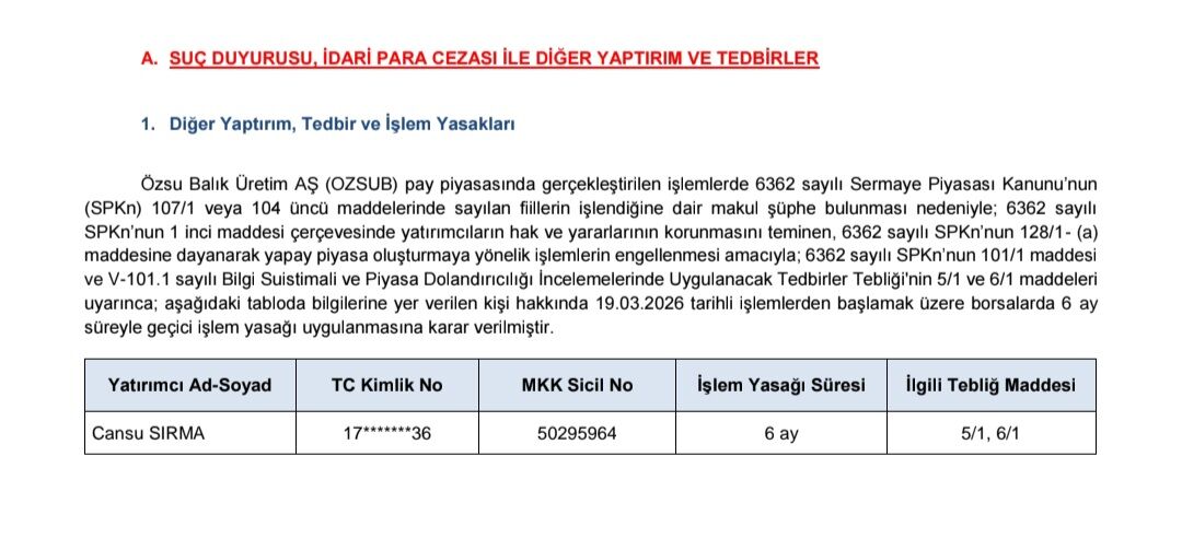 Yatırımcıların hak ve yararlarının korunması ile yapay piyasa oluşturmaya yönelik işlemlerin engellenmesi amacıyla alınan karar uyarınca; Cansu SIRMA isimli şahsa borsalarda geçici işlem yasağı getirildi.