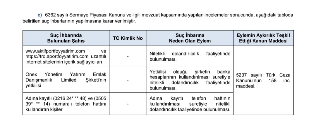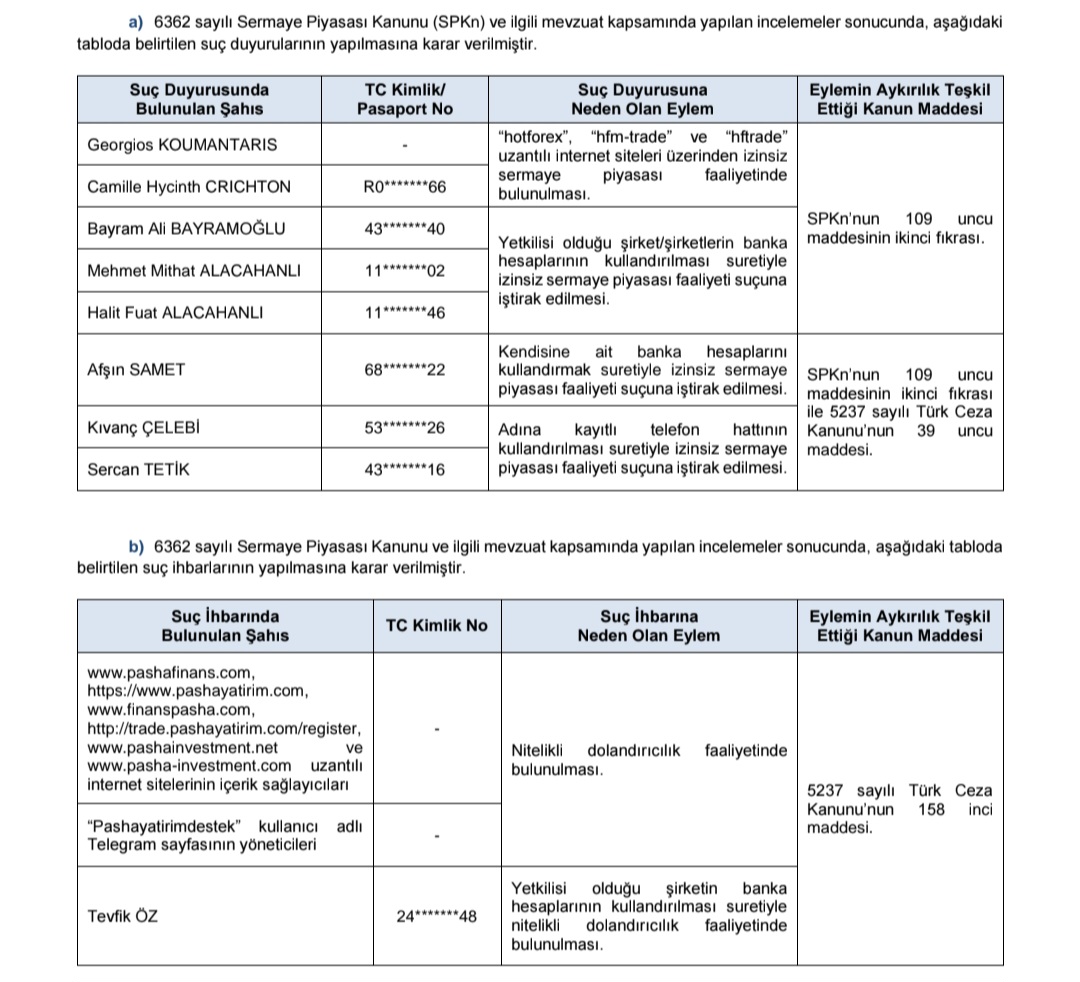 Bunun yanı sıra, kendi banka hesaplarını kullandırarak izinsiz sermaye piyasası faaliyetine iştirak ettikleri belirlenen Afşin Samet, adına kayıtlı telefon hattının kullanılması suretiyle suça iştirak ettiği tespit edilen Kıvanç Çelebi ve Sercan Tetik hakkında da SPKn’nun 109’uncu maddesinin ikinci fıkrası ile 5237 sayılı Türk Ceza Kanunu’nun 39’uncu maddesi uyarınca suç duyurusunda bulunulmasına karar verildi.