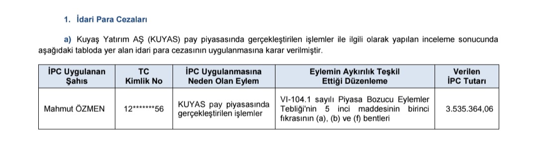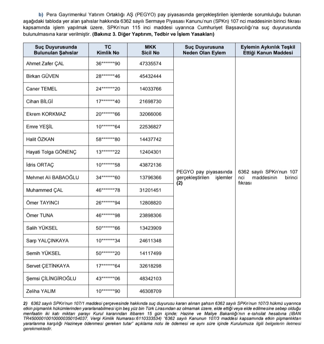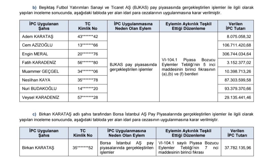 Buna göre; birçok şirket ve işlem hakkında yapılan incelemeler sonucunda aşağıda yer alan kişiler hakkında idari para cezası uygulanması kararı alındı.