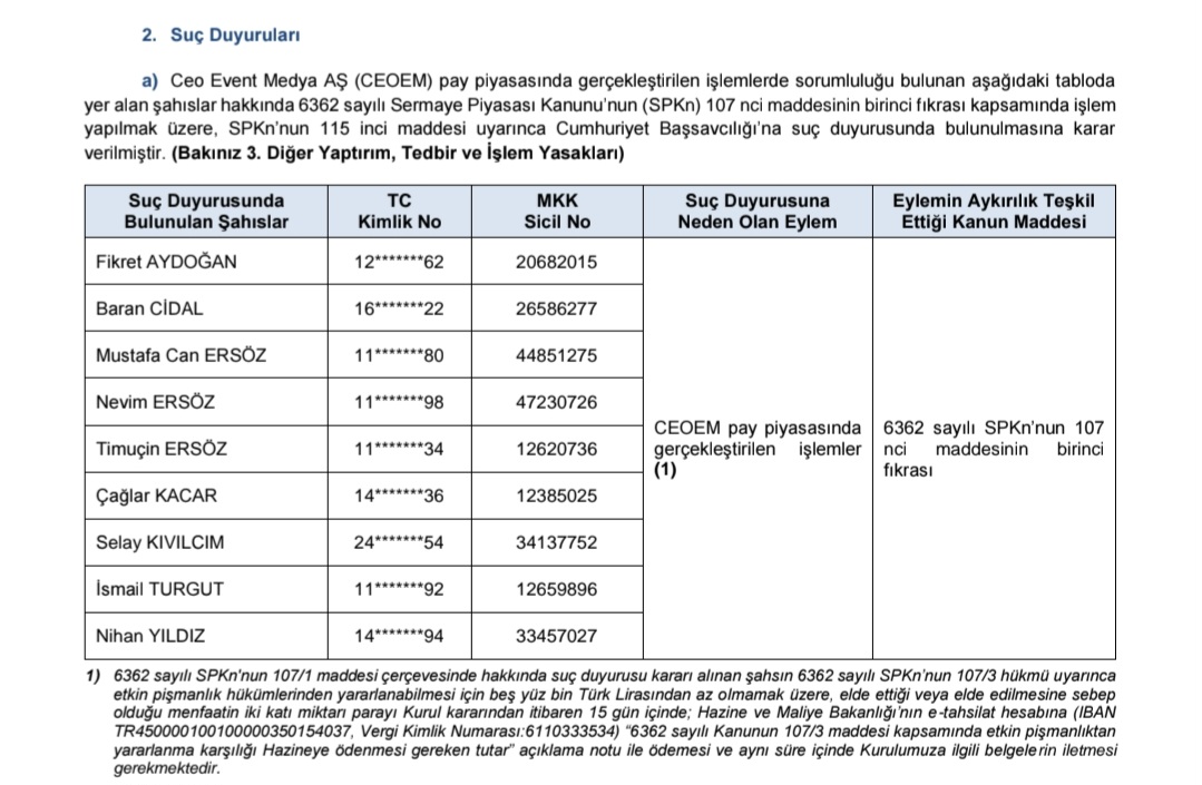 İşte SPK tarafından suç duyurusunda bulunan kişi ve kurumlar: