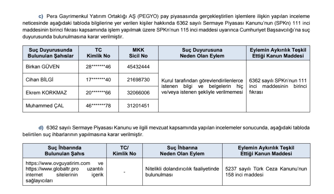Sermaye Piyasası Kanunu (SPKn) ve ilgili mevzuat kapsamında yapılan incelemeler sonucunda, aşağıdaki tabloda belirtilen suç duyurularının yapılmasına karar verildi.