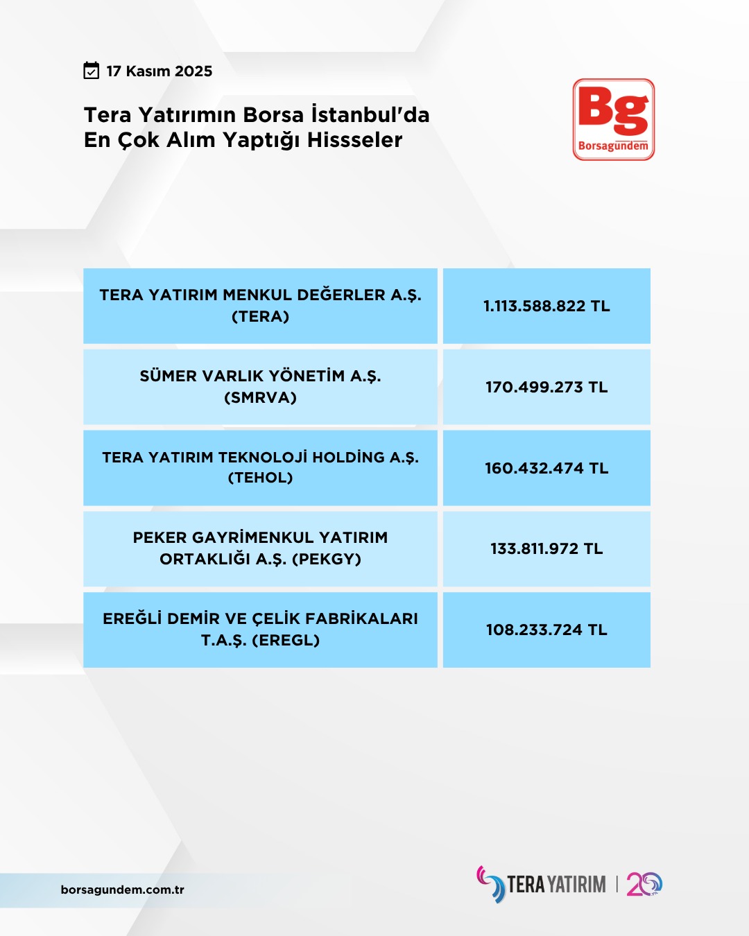 Tera Yatırım'ın bugün Borsa İstanbul’da en çok alım satım yaptığı hisseler...