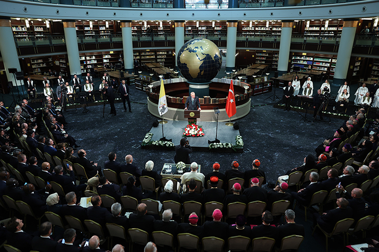 Ziyaretin Türkiye ile Vatikan arasındaki köklü ilişkilerin dostluk, işbirliği ve karşılıklı anlayış temelinde güçlenmesine katkı sağlamasını temenni eden Cumhurbaşkanı Erdoğan, "Başta bu salondan yansıyanlar olmak üzere ziyaret boyunca Türkiye'den verilecek mesajların Türk-İslam dünyasına, tüm Hristiyan coğrafyasına ulaşacağına, dünyada barış umutlarını daha da artıracağına yürekten inanıyorum." diye konuştu.